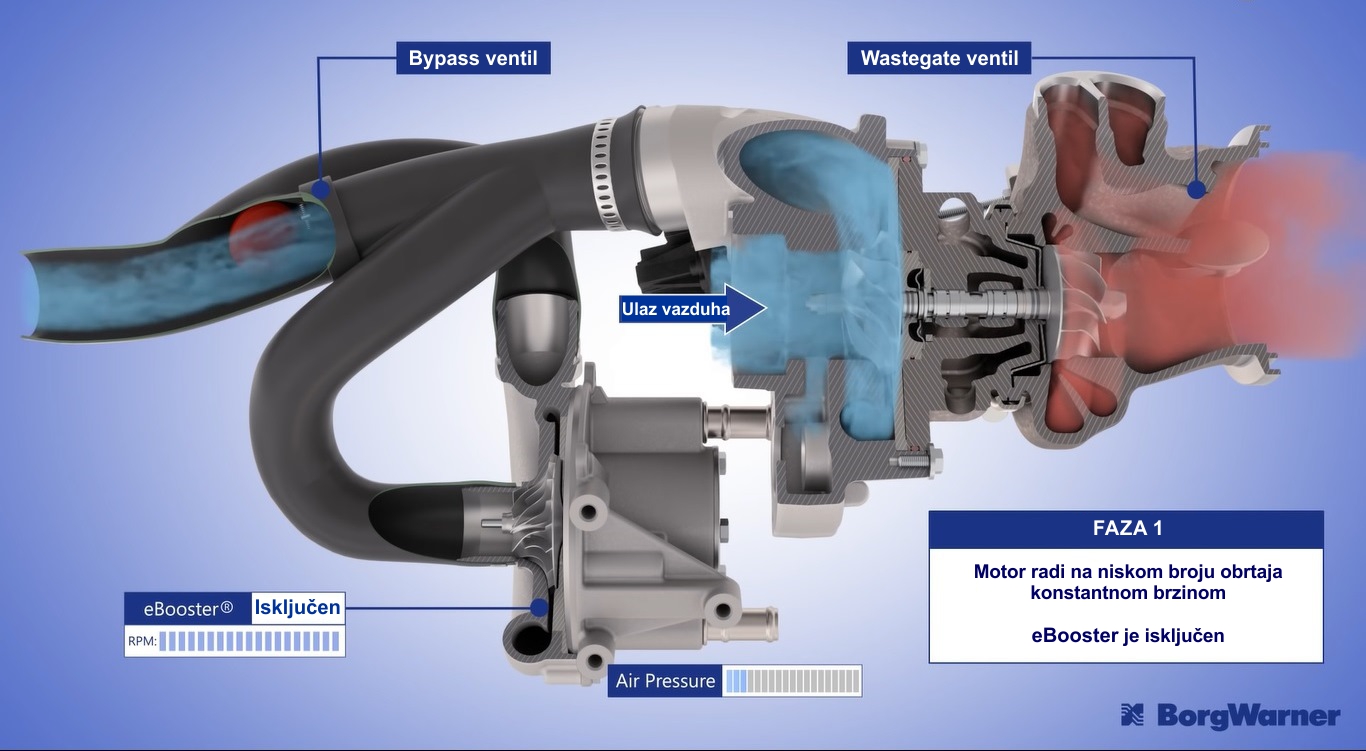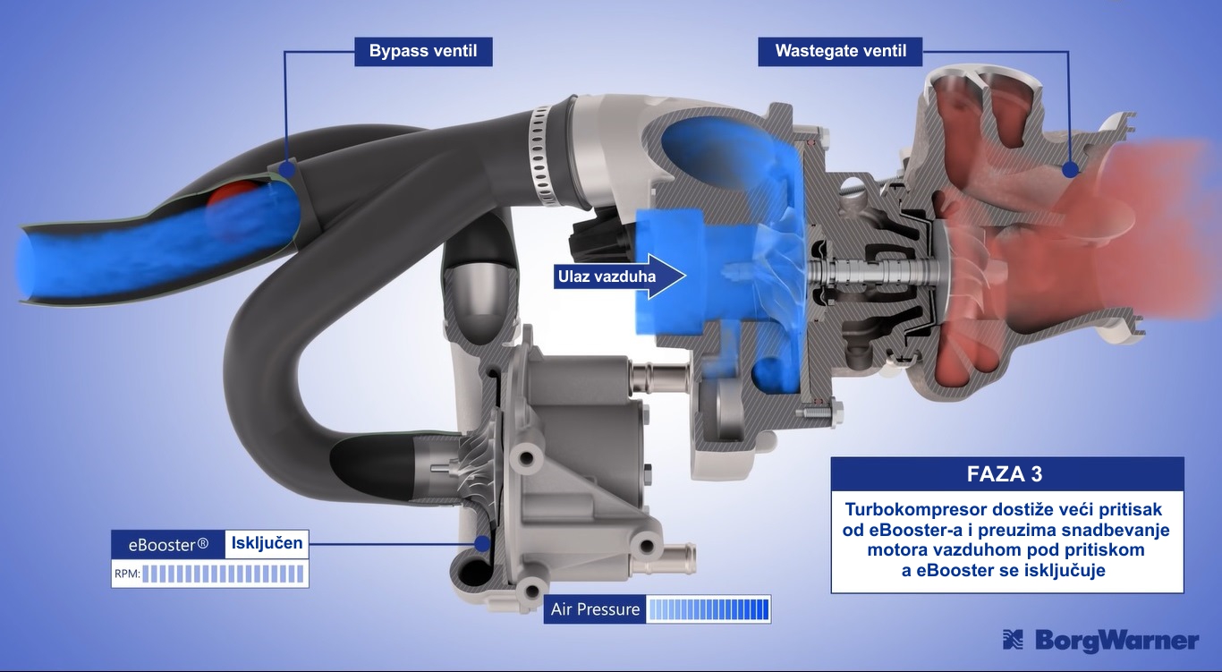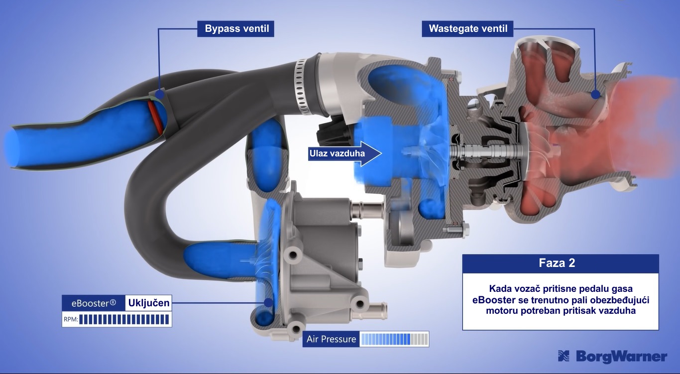 Lider u oblasti turbokompresora BorgWarner je konstruisao i proizveo eBooster kompresor koji u odnosu na standardne turbokompresore reaguje trenutno i nezavisno od broja obrtaja motora.