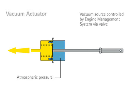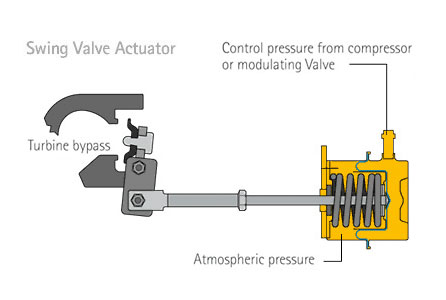 Komora ventila je podeljena na dva dela membranom. Sa porastom pritiska u turbini, raste i pritisak u komori ventila, sve do nivoa koji je dovoljan da pomeri oprugu osovine. Kod dizel aplikacija, pritisak otvaranja wastegate ventila je prilično veći nego na benzinskim aplikacijama. |